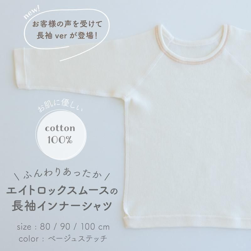 【メール便OK(03)】ふんわりあったかエイトロックスムース 長袖インナーシャツ 無地 ベージュステッチ 80/90/100cm 日本製
