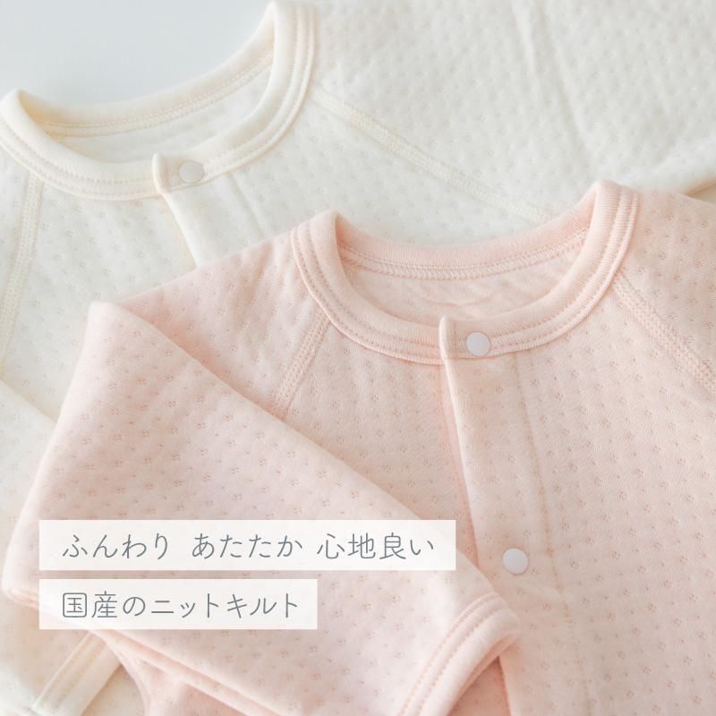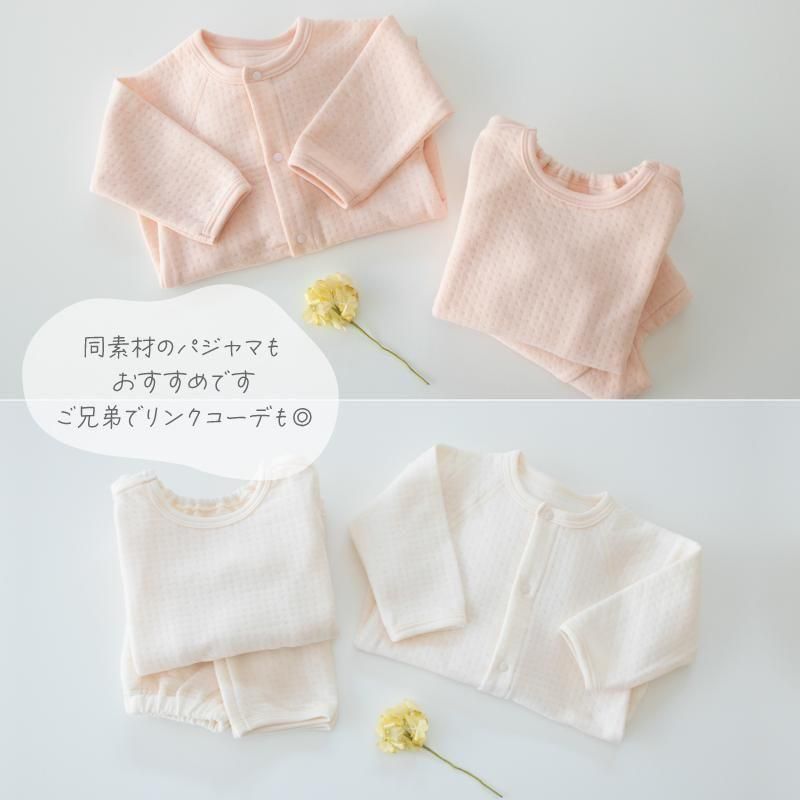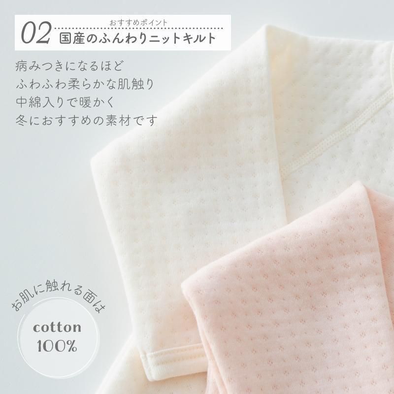 | おすすめ ポイント | ・保温性に優れた国産のふんわりしたニットキルト生地を使用しています。 ・表側と裏側の肌に触れる面は綿100%です。 ・綿100%生地で、中わたのポリエステル繊維を挟んで仕上げています。 ・生地に空気層が生まれ、保温効果が高まります。 ・適度な保温性で、お部屋着に最適です。 |