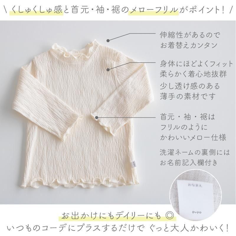 おすすめポイント | ・くしゅっとした素材が可愛いTシャツです。 ・肩ボタンはありませんが、伸縮性があるためお着替えしやすいです。 ・襟・袖・裾部分はフリルのようにかわいいメロー仕様です。 ・レギンスにも、スカートにも、どんなものでも合わせやすいシンプルでおしゃれなトップスです。 |