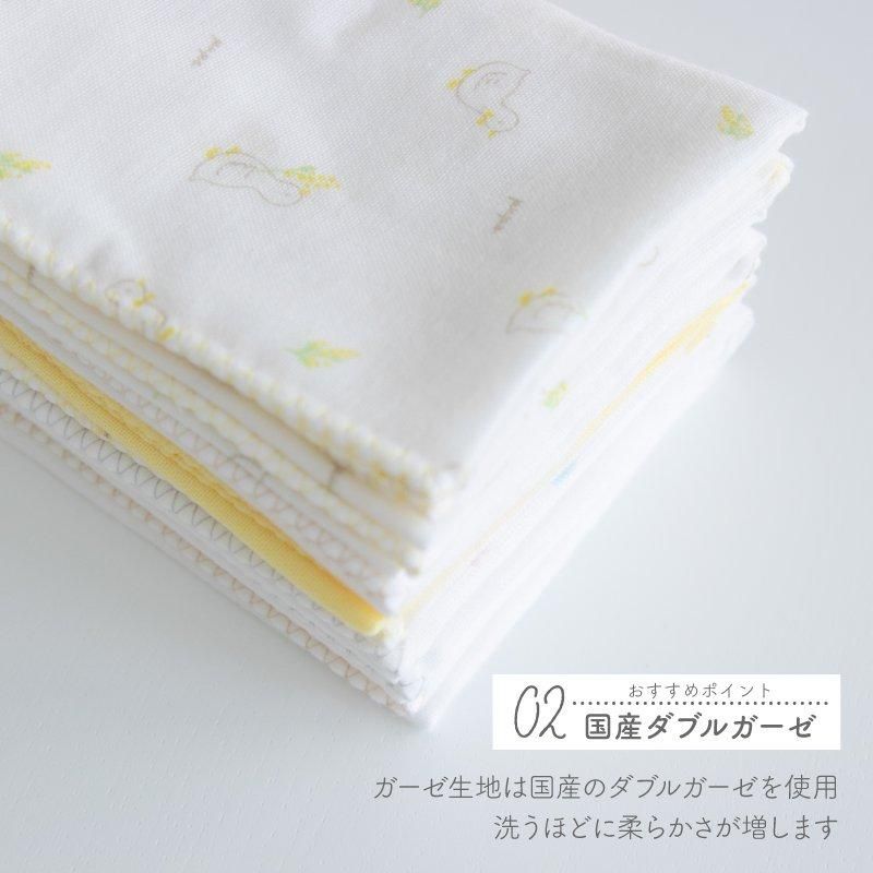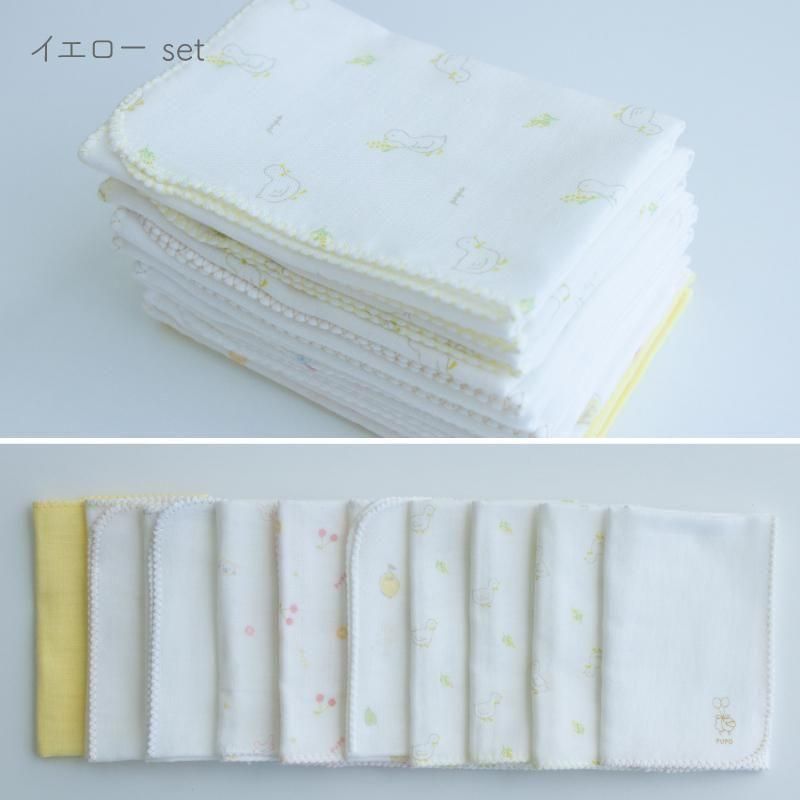 | セット内容4 | イエローセット 無地(イエロー)×1枚、無地(ベージュステッチ)×1枚、無地(グレーステッチ)×1枚、うさぎくまねこ柄×1枚、フルーツ柄×1枚、レモンフルーツ柄×1枚、あひるとミモザ柄×3枚、ワンポイント(羊柄)×1枚 |