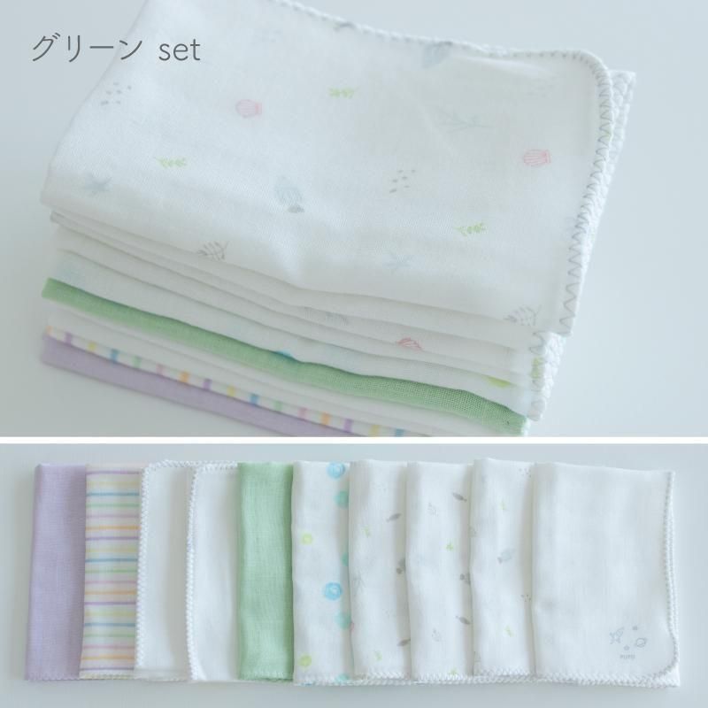 | セット内容1 | グリーンセット 無地(ラベンダー)×1枚、カラフルボーダー×1枚、無地(グレーステッチ)×2枚、無地(グリーン)×1枚、マリン柄×3枚、ワンポイント(宇宙柄)×1枚 |