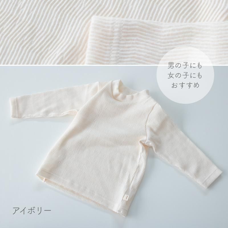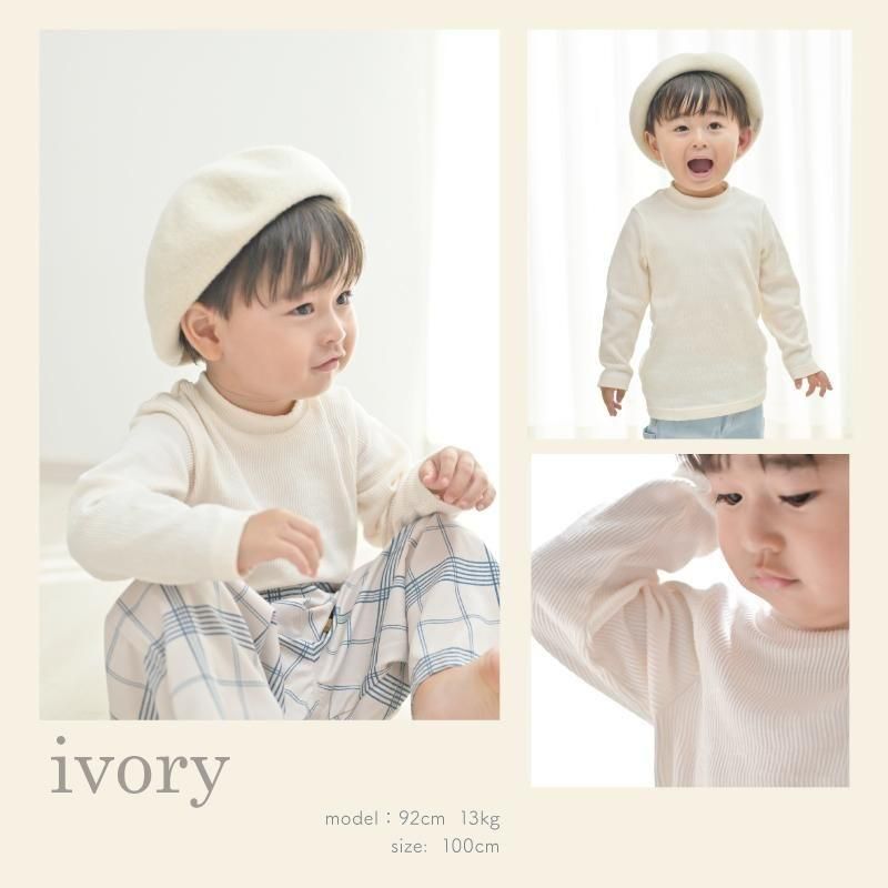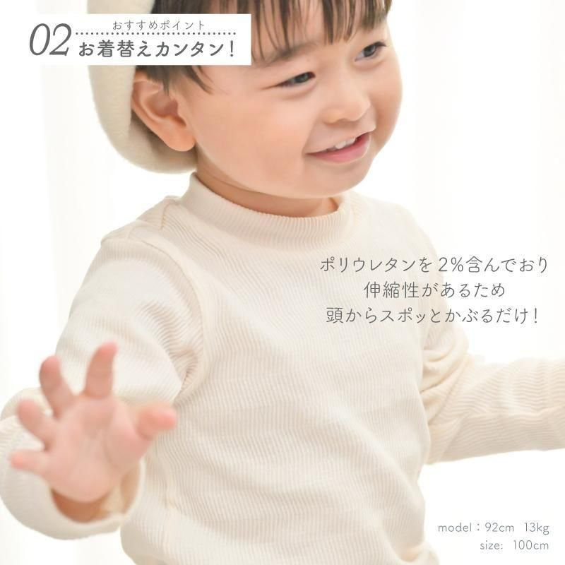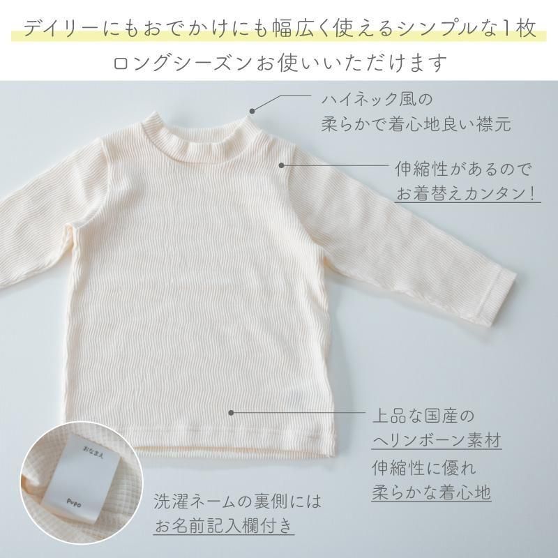 おすすめポイント | ・軽やかで柔らかな国産のヘリンボーン素材を使用しています。 ・シンプルだけどおしゃれな凹凸感があるヘリンボーン素材です。 ・ポリウレタンを含む柔らかな生地はストレッチが効いて動きやすく、伸縮性があり着心地抜群です。 ・ハイネック風の柔らかで着心地良い襟元です。 ・シンプルデザインで重ね着にも大活躍。 ・サロペットやワンピース、トレーナー、カーディガンのインナーとしてもおすすめです。 ・洗濯ネームの裏側にはお名前記入欄が付いています。 |
