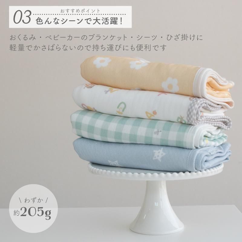 | おすすめ ポイント | ・吸水性、通気性に優れた6重ガーゼを使用したブランケットです。 ・お昼寝、ブランケット、大人のひざ掛け、ベビーカーなど様々なシーンでご使用いただけます。 ・ガーゼを6層に重ねることで、中にふんわりと空気層ができ、冬はあたたかく夏は汗をすばやく吸収します。 ・6重ガーゼはお洗濯を繰り返すほどにふっくら柔らかな風合いが生まれます。 ・洗濯機(ネット使用)で気軽にお洗濯ができます。 |